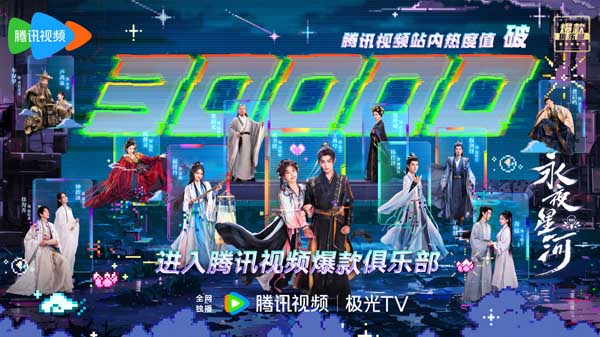 《永夜星河》自播出以来,剧集凭借独创的赛博古装轻喜类型、新奇的故事视角、多元包容的内核价值观等,在口碑和热度等多个维度上一路保持高热走势,微博、抖音、小红书等多个平台话题讨论不断。豆瓣涨分至7.7,微博开分9.3,全网收获热搜超9800+。目前,除了在腾讯视频全网独播,《永夜星河》在全球多家媒体同步播出,不仅在腾讯视频海外版WeTV、Youtube、Rakuten Viki、Viu、VieON等多家海外媒体、全球平台Netflix与国内同步播出,还将陆续在韩国流媒体平台MOA、韩国AsiaN电视台、台湾爱尔达电视台、柬埔寨PPCTV电视台以及日本流媒体平台U-Next等多个地区的主流平台播出,持续在全球范围内产生影响力。并在北美平台Rakuten Viki获得评分9.4、IMDb获得评分8.3、海外评分网站MyDramaList获得评分8.4。该剧以极具青春热血、富有新潮思辨的故事内容,在海内外年轻人范围中引发热议与好评,持续在全球范围内产生影响。