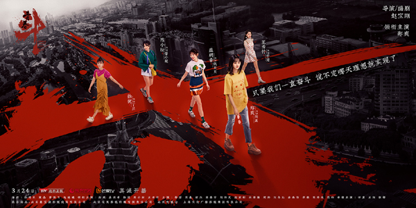 海报中,巨大的“斗”字一横一竖横亘于城市的十字路口,如同五位女生的青春之路,该往哪儿走?似乎每个人都有着各自的方向。向真(郑爽饰)走在一行人最前方,画面中的她朝气蓬勃、意气风发;而钱贝贝(盖玥希饰)、丁兰(徐悦饰)、晋小妮(陈小纭饰)、于慧(王秀竹饰)也各自在“青春”之路上自信洒脱、青春洋溢。站在青春的十字路口,五位女主人公看上去并不迷茫;身处色调灰暗的北京,五位女主人公脸上却写满了阳光。